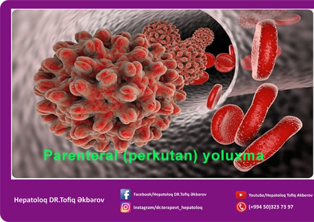 Parenteral (perkutan) yoluxma: HBV –nun parenteral yoluxması dedikdə damar içi tranfuziya və infeksiyonlar, dializ, akupunktur, döymə, manikur, pedikur, qeyri steril şəraitdə olunan sünnət və istər böyük istər kiçik olan cərrahi və ginekoloji prosedurlar ( abort) və müdaxilələr nəzərdə tutulur. Amerika və Avropa da damar içi yoluxma HBV-ilə 23%təşkil edir. Son zamanlar qan və qandan hazırlanmış vasitələrin, eyni zamanda qan donorlarının ciddi yoxlanılması damar içi yoluxma riskini azaltmaqdadır. Hemafiliya və talassemiya olan xəstələrə çoxlu transfuziya olduğu üçün bu xəstələrdə yoluxma riski çox yüksəkdir. Bu riskin düşürülməsi üçün donor qanlarının və ondan hazırlanmış plazma və qan kütlələrinin ciddi ikili testlə yoxlanılması və nukleik asit testlərinin aparılması düşünülmüşdür. Əgər ABŞ-da post tranfuzyon hepatit sayısı bir milyon qanda 4-isə, Çin də bu sayı 17,500-dür.
